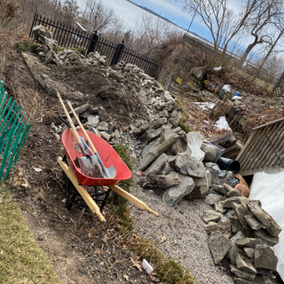Just finished Phase 2 of this beautiful backyard project. My client had acquired a yard full of limestone from a nearby excavation and wanted to use it to build a small dry-stone wall as a property divider. I started the project by sorting the rocks into different sizes and shapes, then began digging the trench that the stones would sit in. I lined it with landscaping fabric and filled it with crushed gravel and used the compactor to tamper it down. Then I began the labour of love that was the wall, using the largest stones on the base and slowly making my way up to the 3 foot height, backfilling the free space between stones with gravel and soil to help keep the structure strong and stable. I then removed the remaining soil and stones from the yard in order to begin Phase 2. I removed the top layer of soil as well as the existing pea gravel, laid landscaping fabric and covered with four yards of fresh pea gravel. This project was a lot of work - battling the snow and rain, as well as a steep stair entry to the backyard. Regardless of any challenges I am so pleased with the outcome.
